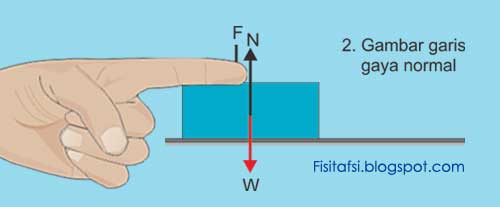 Selanjutnya gambar garis untuk gaya normal. Ingat gaya normal adalah gaya yang diberikan bidang pada benda dan arahnya tegak lurus bidang. Karena bidangnya datar dan lurus, maka arah gaya normal tegak ke atas seperti terlihat pada gambar di atas.